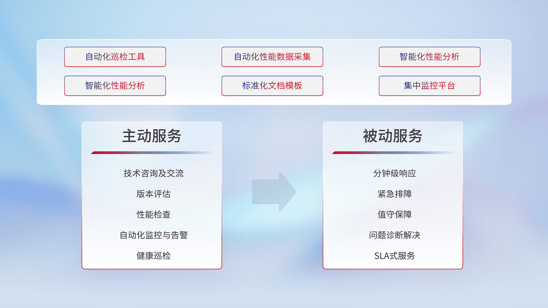 智能化工具和标准化文档,,,,保障服务质量,,提供主动服务(包含技术咨询、、、版本评估、、性能检查、、、自动化监控与告警、、、、健康巡检)和被动服务包含(分钟级响应、、紧急排障、、、值守保障、、、、问题诊断解决、、、、SLA服务)。。。。